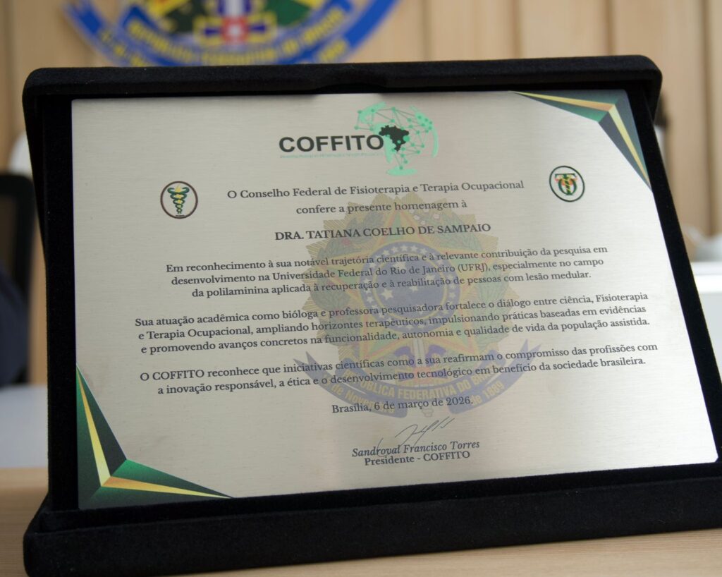 Durante o evento, que discutiu avanços científicos relacionados à reabilitação neurológica no tratamento de pacientes com lesão medular, o Dr. Sandroval entregou para a pesquisadora da UFRJ uma placa de homenagem pelo trabalho que está sendo realizado. Emocionada, a Dra. Tatiana agradeceu pelo reconhecimento aos seus estudos.